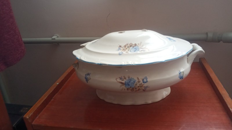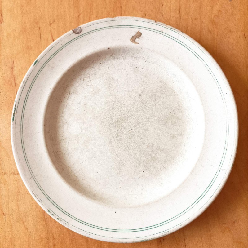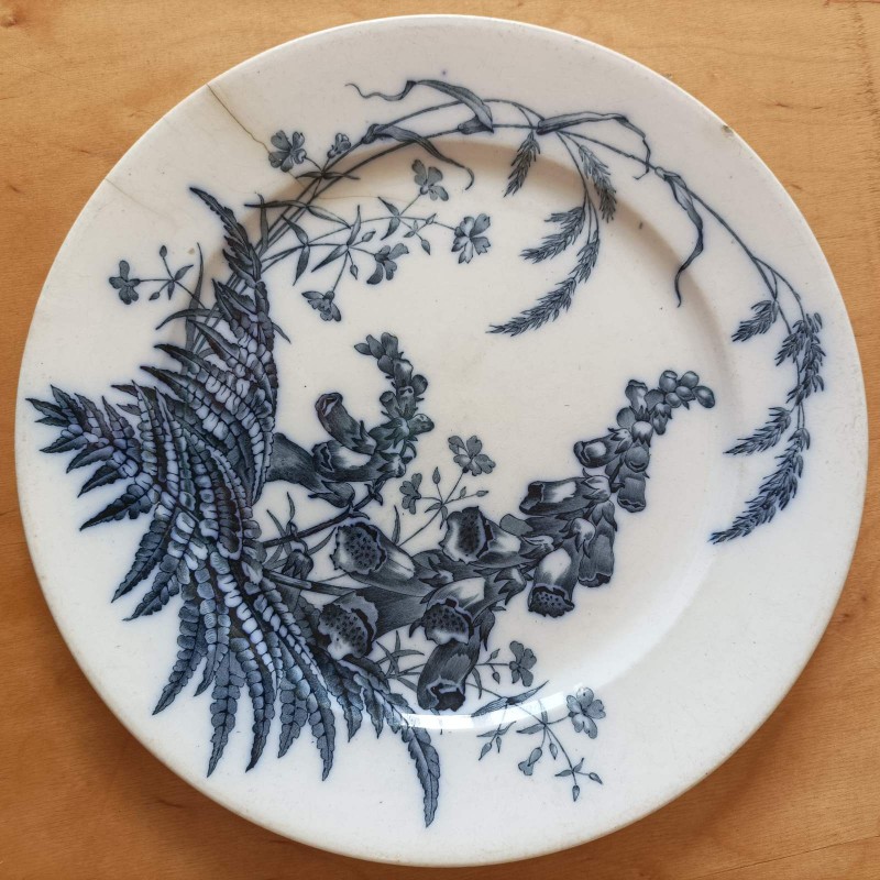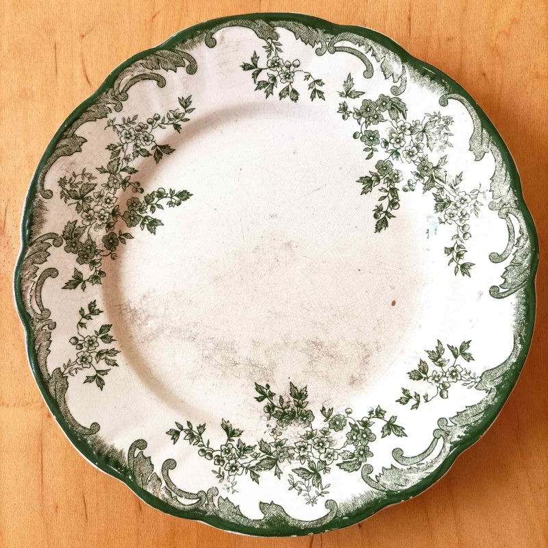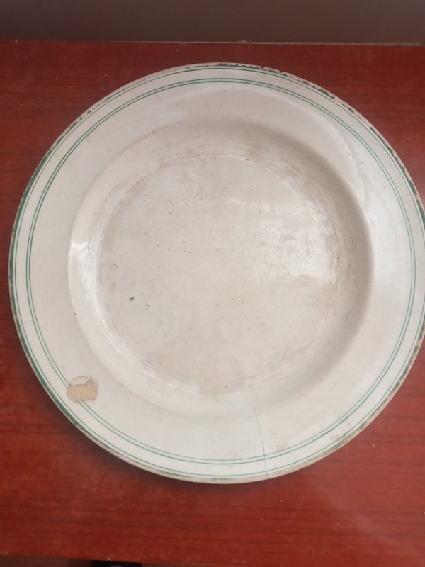 Тарілка глибока супова, з зображенням кошика з гронами винограду, папугою та меандром по юортах, малюнок розташовано по всій площині " дзеркала". Блюдо складається з 2 фрагментів, склеєно та додатково скріплено стрічкою.Шов розламуц коричньового кольору. Подряпини фарбового кольору. ХІХ-ХХ століття. Автор- завод Кузнецова