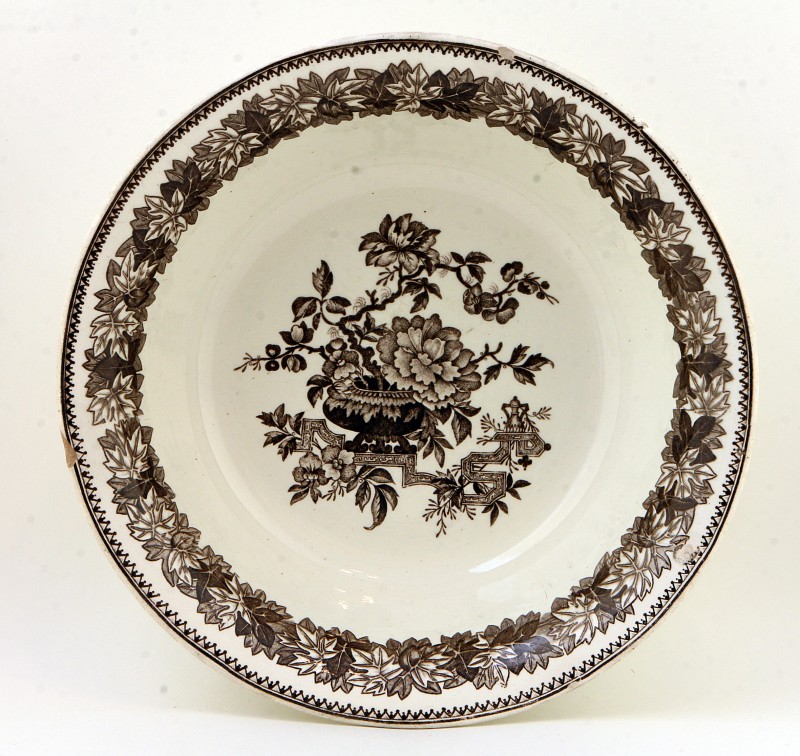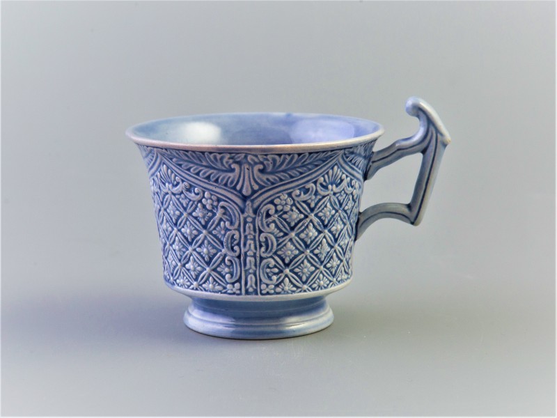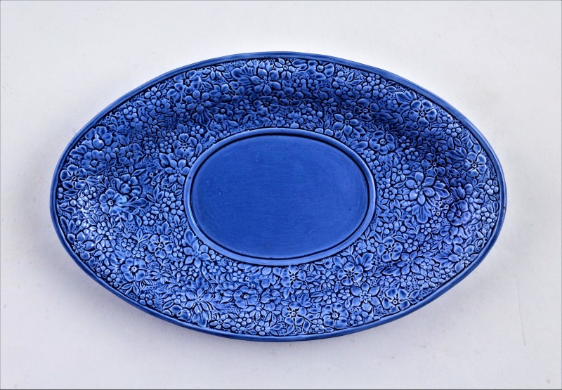 Кругла блакитного кольору з фестонованим краєм. Площина тарілки повністю вкрита рельєфним декором хмелю з плодами. Марка: відтиск в масі «1864»; літери «В.Б.».