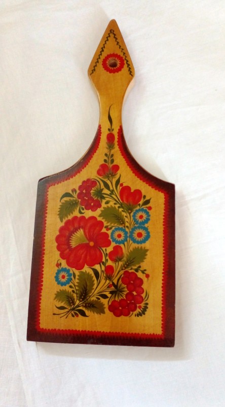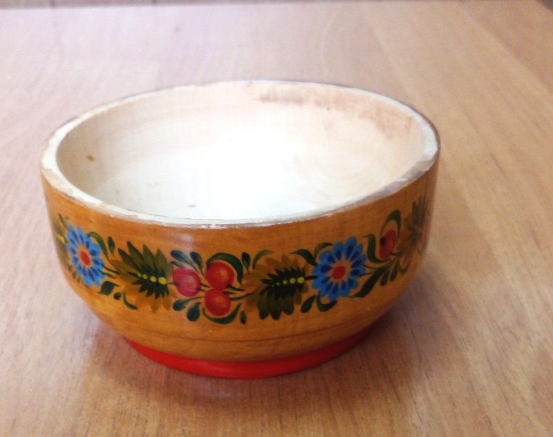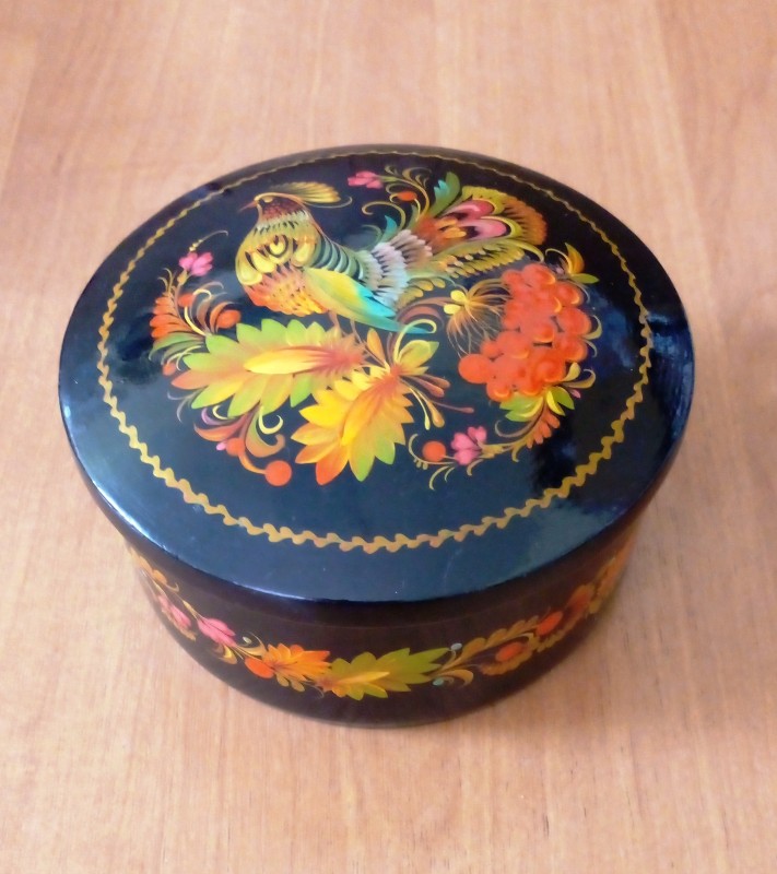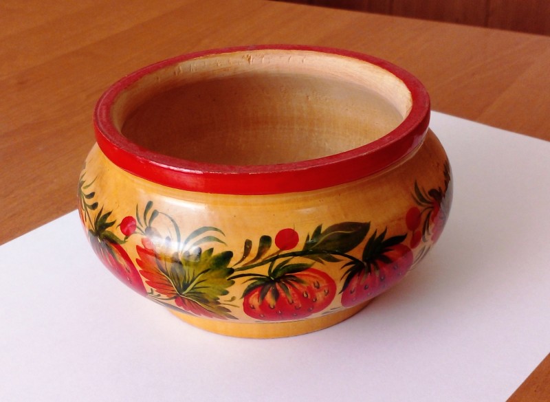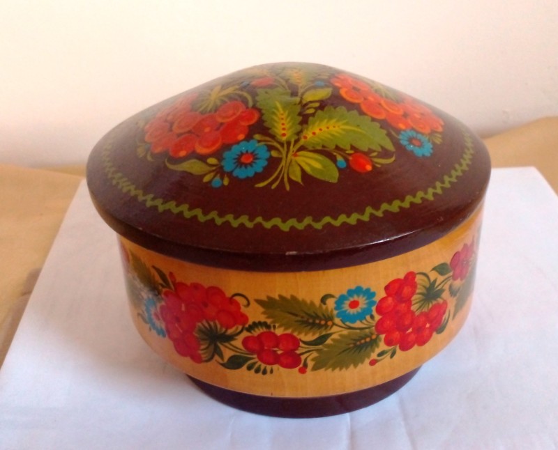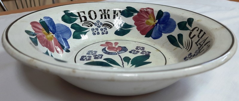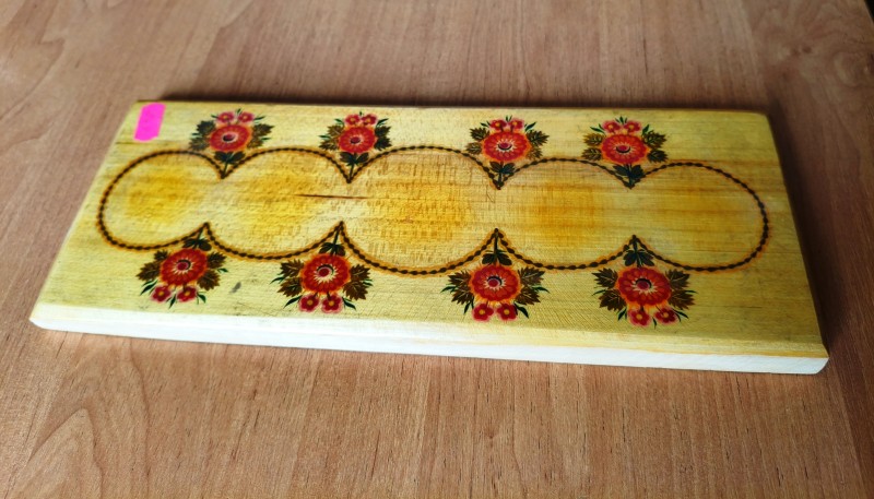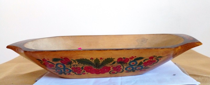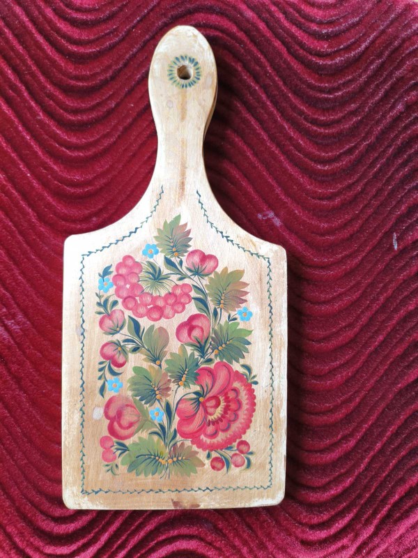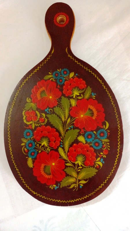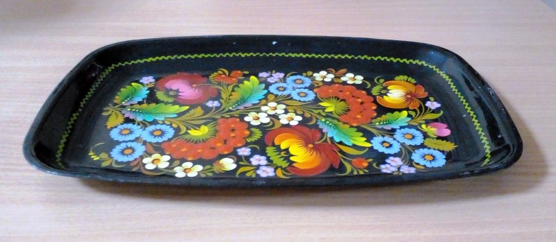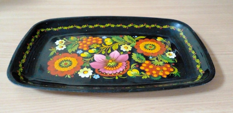 Тарілка чорного кольору прикрашена петриківським розписом. В центрі - кетяг калини. По внутрішньому краю - "бігунок" з червоних квітів, ягід та зеленого листя.