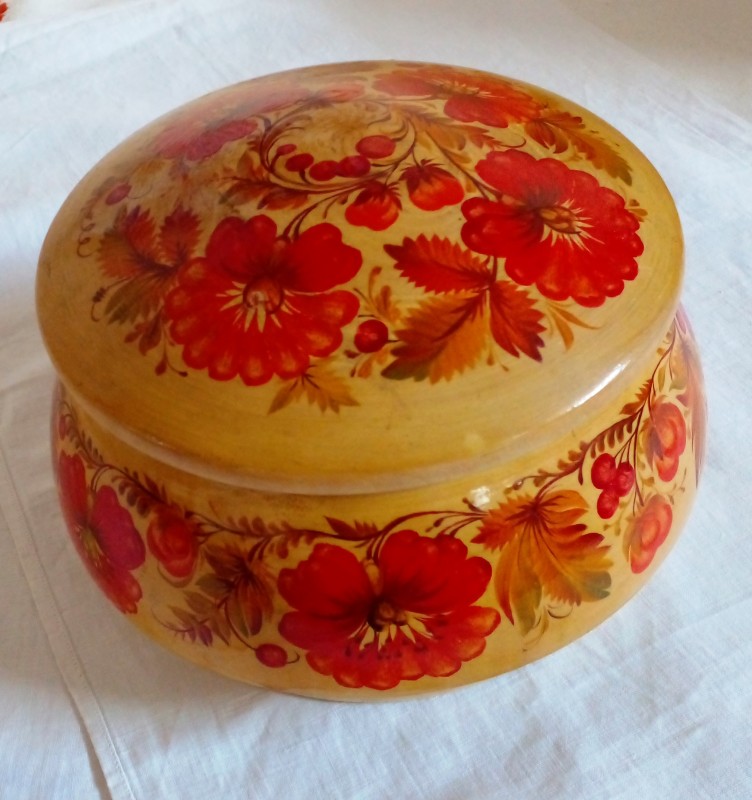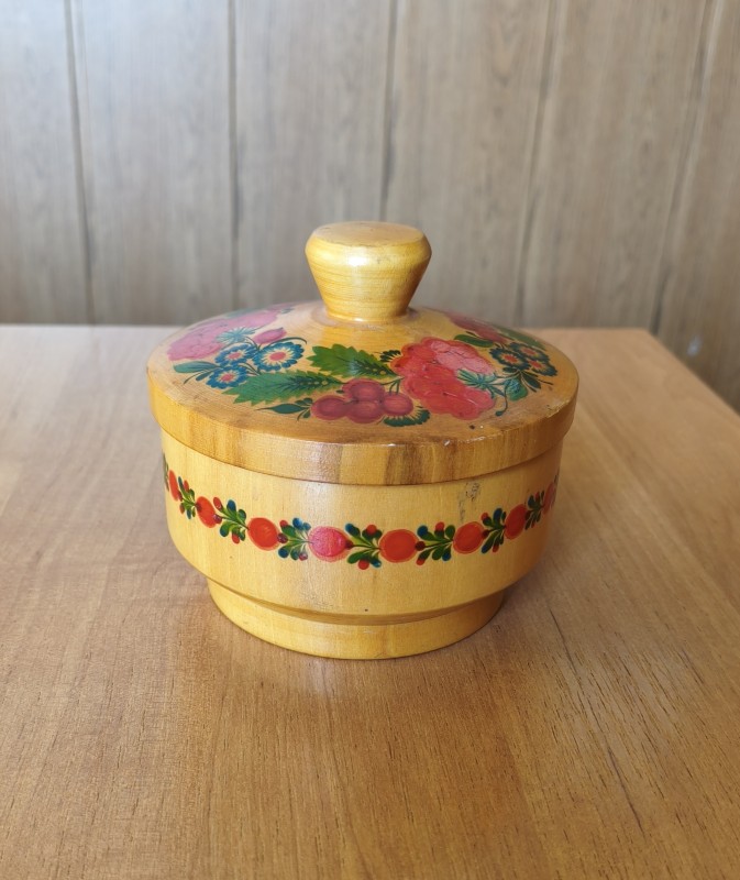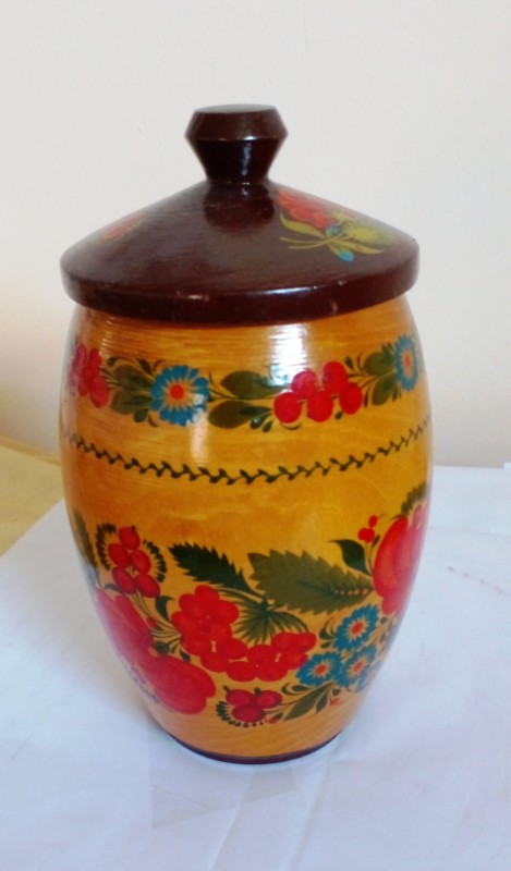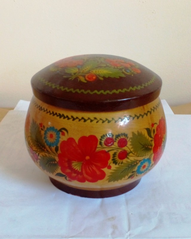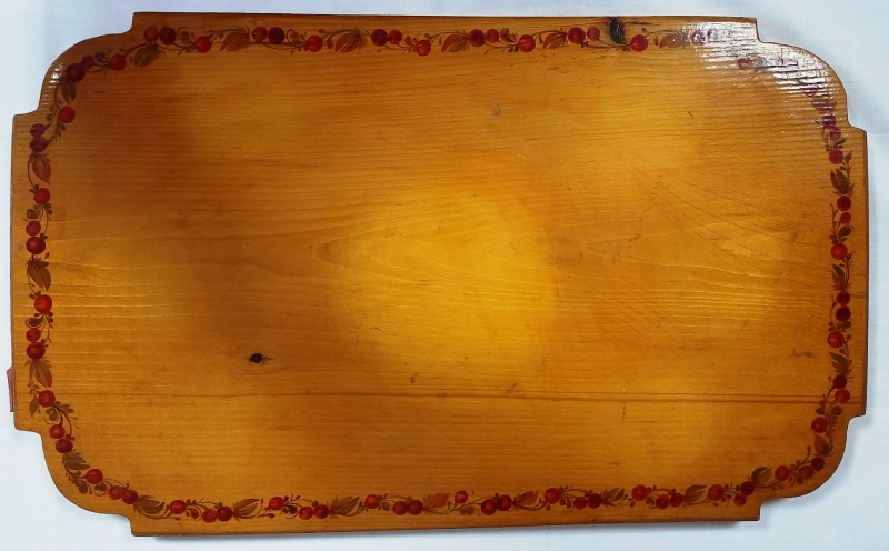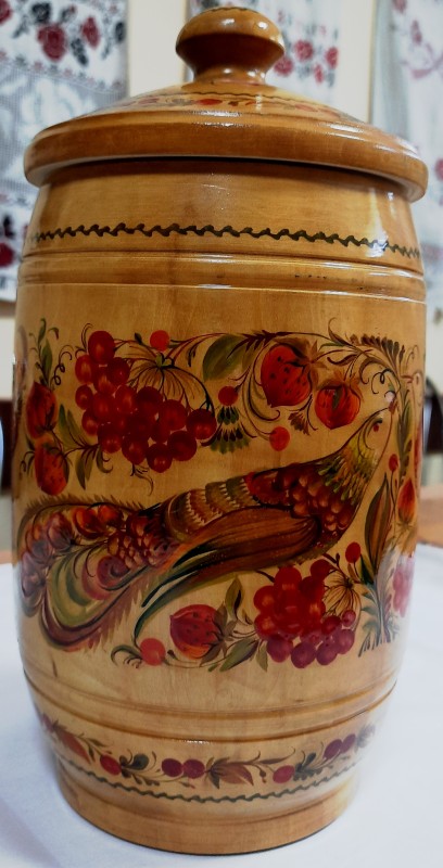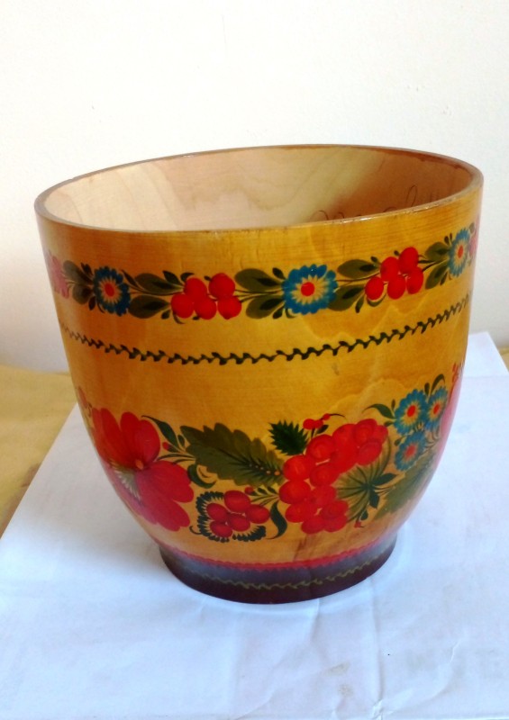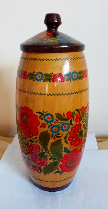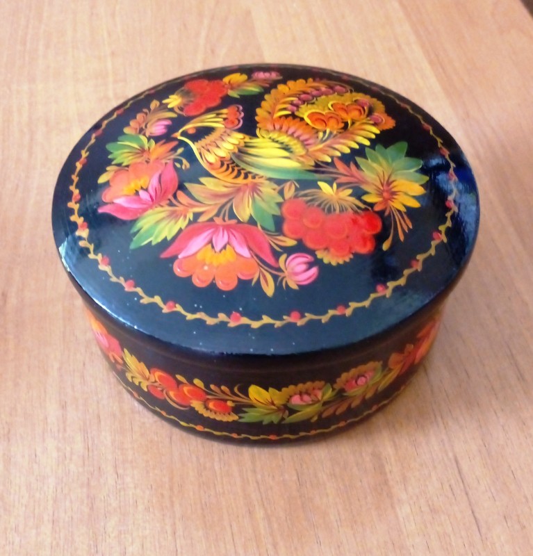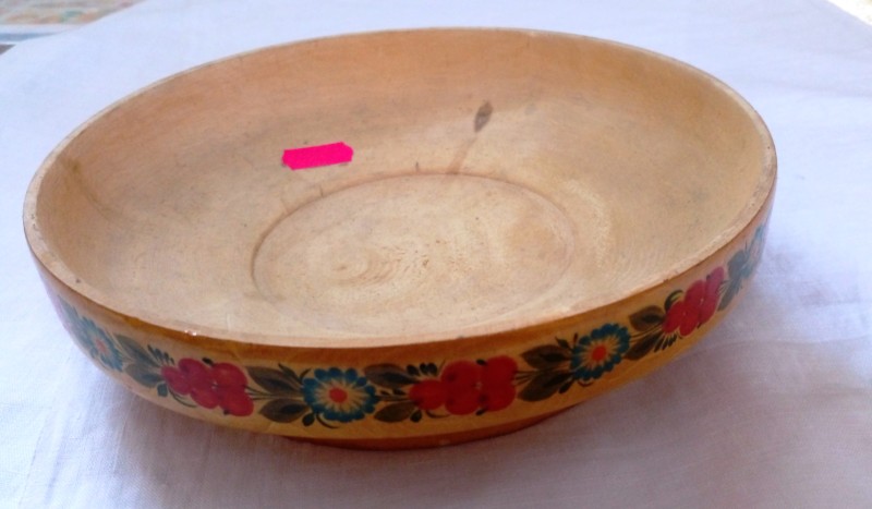 Тарілка чорного кольору прикрашена петриківським розписом. В центрі - кетяг калини. По внутрішньому краю - "бігунок" з червоних квітів, ягід та зеленого листя.