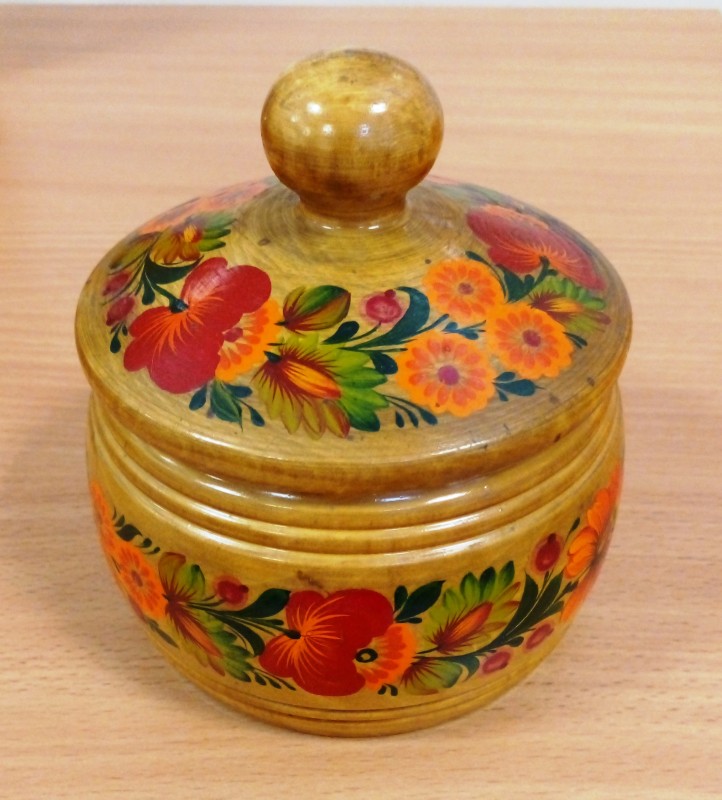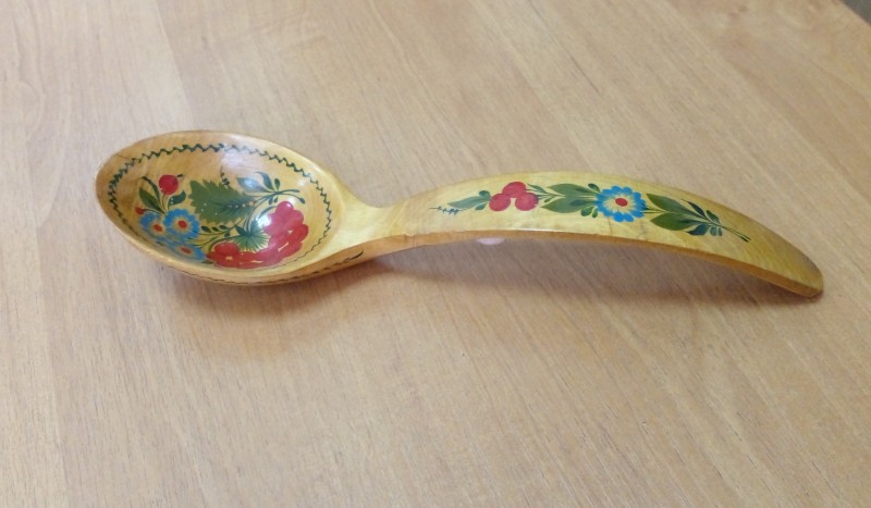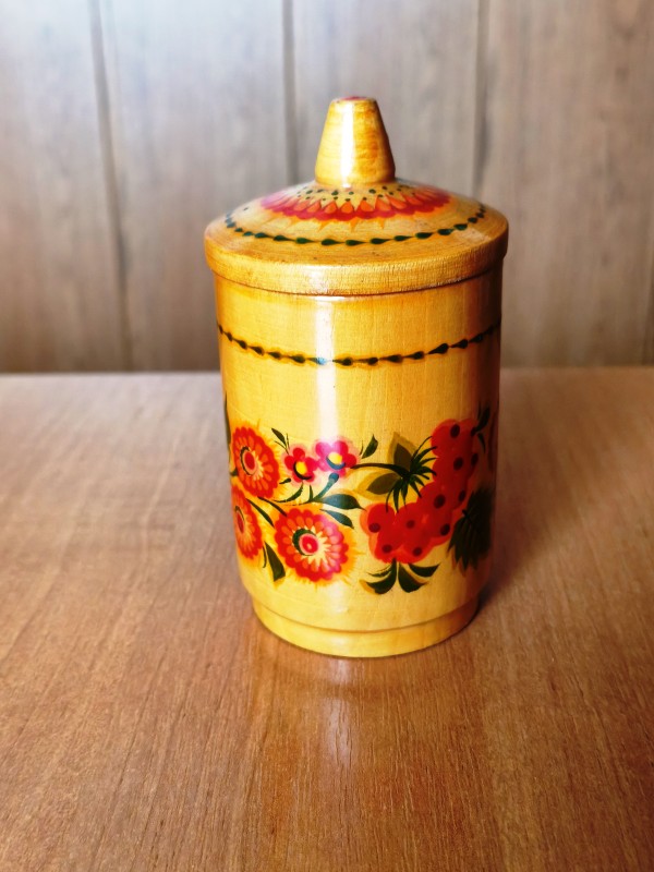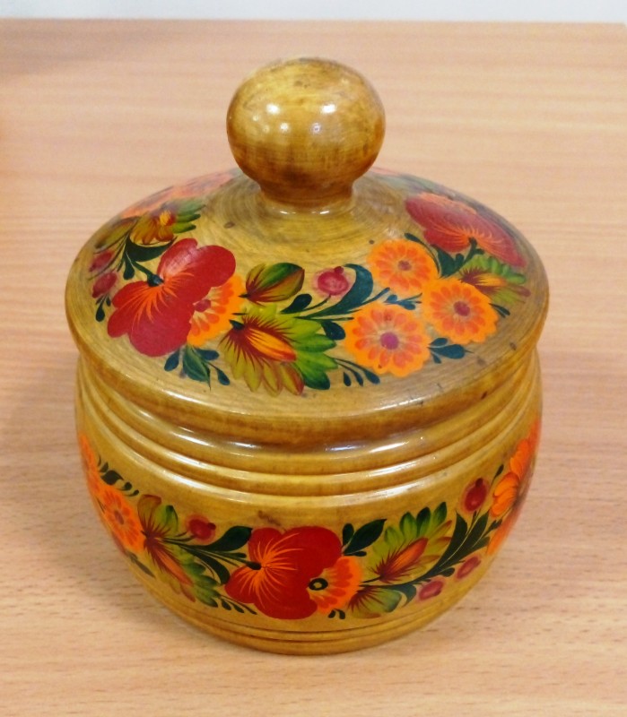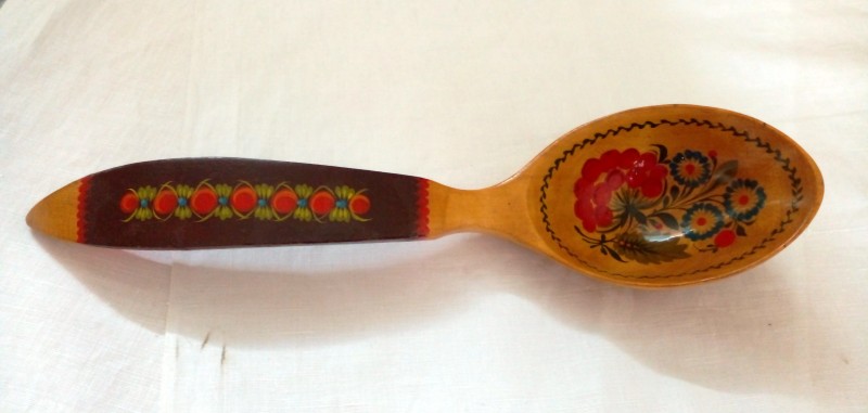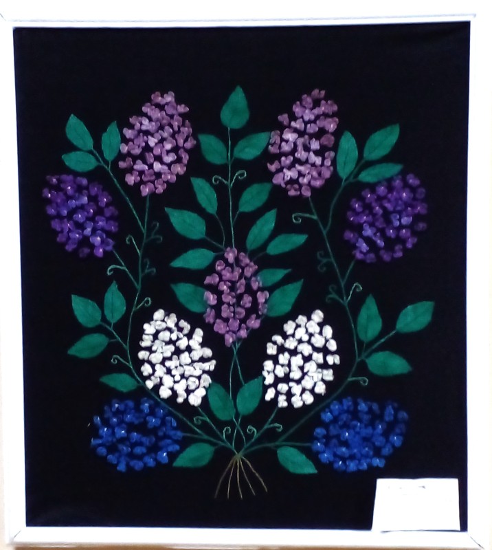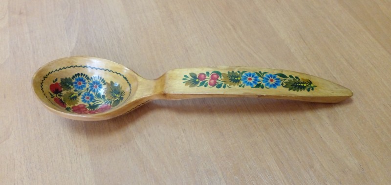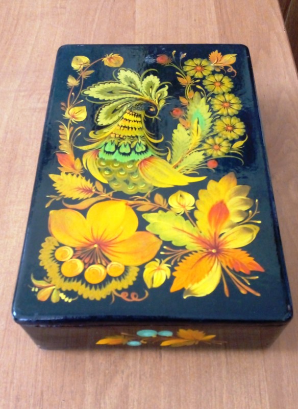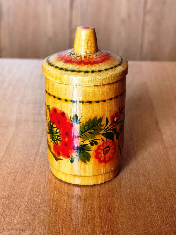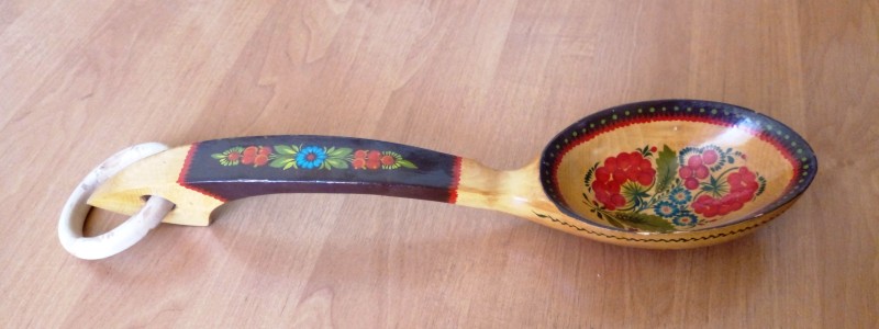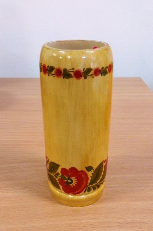 Тарілка чорного кольору прикрашена петриківським розписом. В центрі - кетяг калини. По внутрішньому краю - "бігунок" з червоних квітів, ягід та зеленого листя.