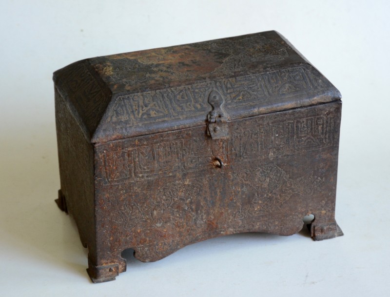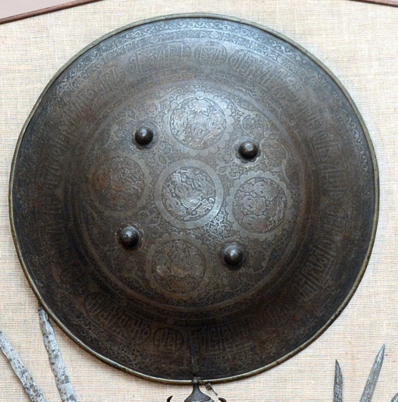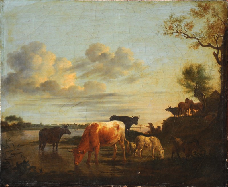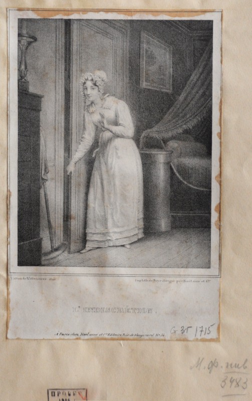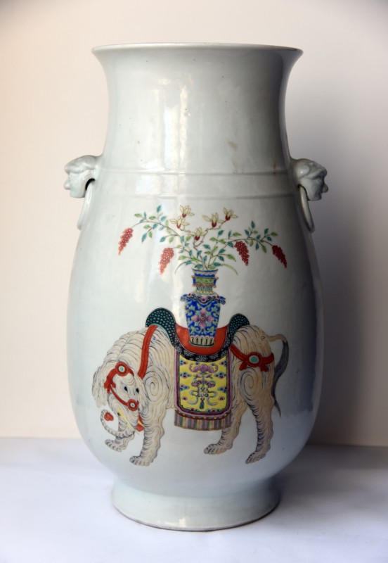 Ваза краплеподібної форми з високою шийкою. На білому тлі є поліхромний розпис, близький по гамі до китайського розпису "зеленого сімейства" з переважним блакитним кобальтом, зеленим, жовтим і фіолетовим кольорами. На тлі рослинності (дерева та кущі) на одній стороні вази зображений юнак у зеленій кофті та жовтій спідниці з тюрбаном на голові. На поясі у юнака висить крива шабля в піхвах. В опущеній правій руці він тримає стрілу вістрям вниз. З іншого боку вази зображено дівчину в блакитній накидці з широкими рукавами, в коричневій спідниці та жовтому тюрбані. У правій руці дівчина тримає квітку. Через кущі виглядає голова лані. Над головою дівчини летить синій птах з довгим дзьобом. На дні є три паперові наклейки: одна - стандартний бланк ОМЗСМ, на другій написано: "ВИ - 112 19. 10. 51", на третій наклейці напис: "Ломбус 3610". Також на дні є напис темно-блакитним лаком: "ВИ-112", а також написи "ДХМ. 384 Инв. 1891".На тулові декілька сколів емалі. Ніжка відбита.