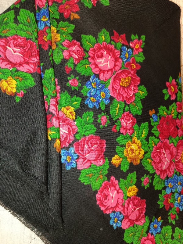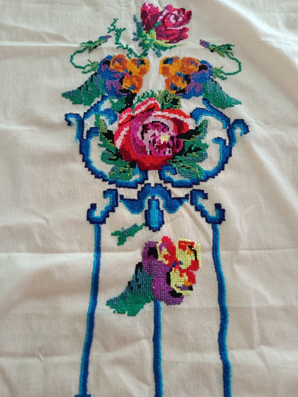 Вишита серветка на білому полотні, техніка вишивання "хрестик", орнамент рослинного характеру - в нижньому куті вишито червоні маки з салатовим листям, по краях зроблено мережку з ниток. Вишивала Коханюк Євгенія з с.Граддя 80 -ті р.