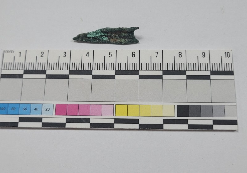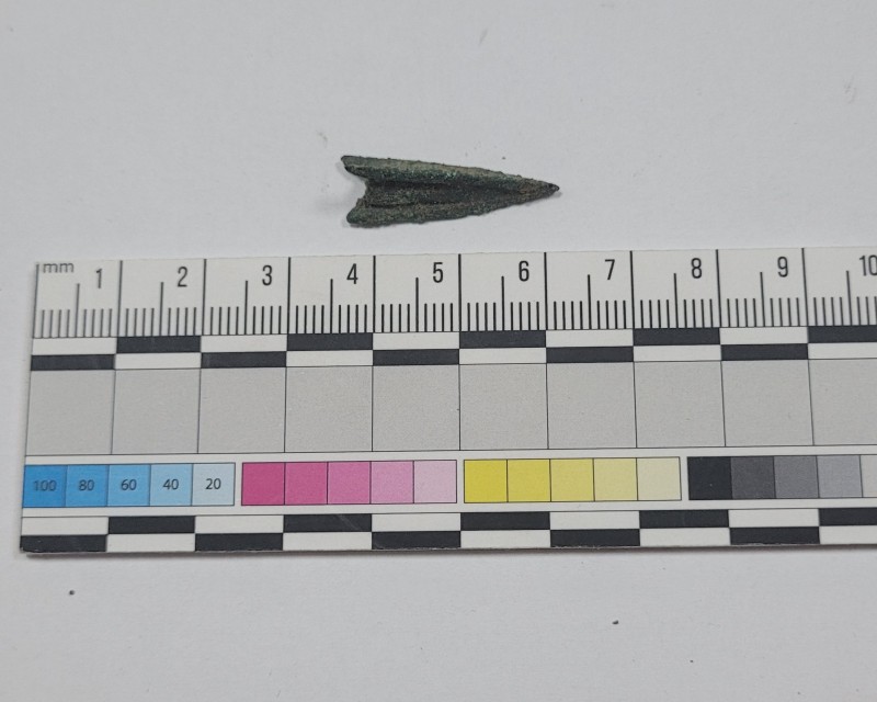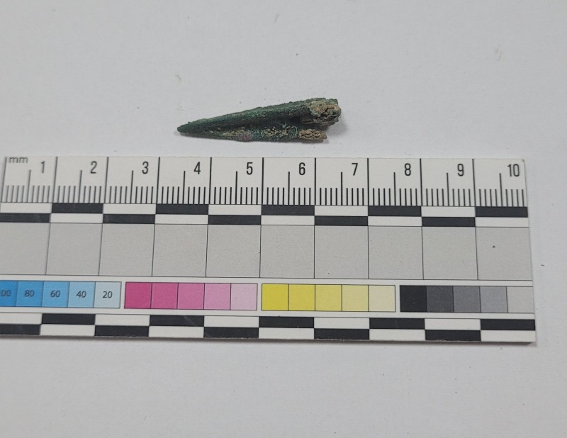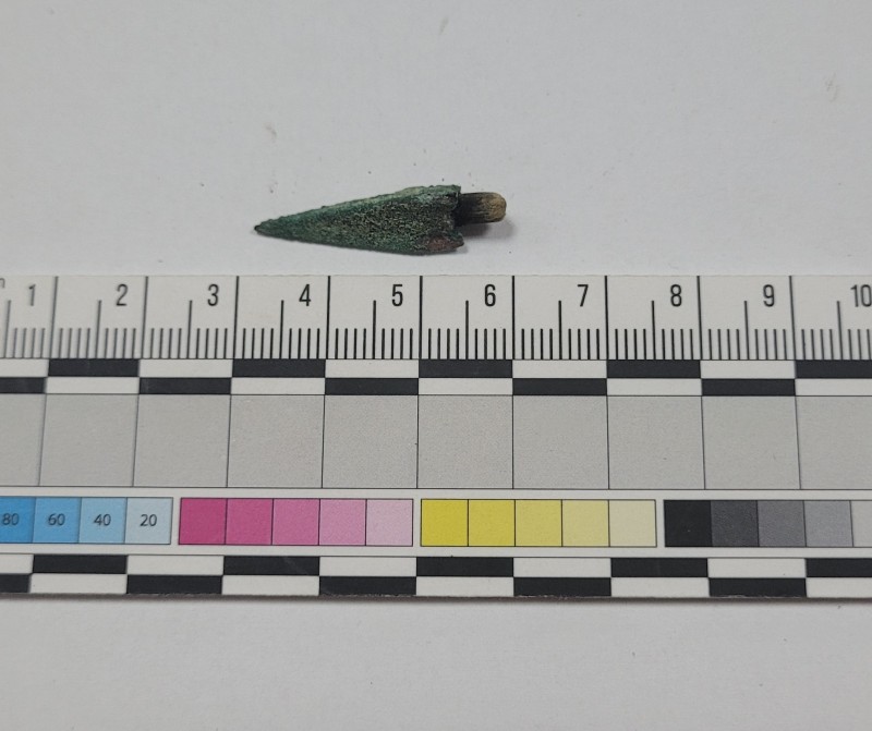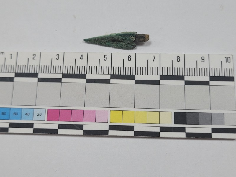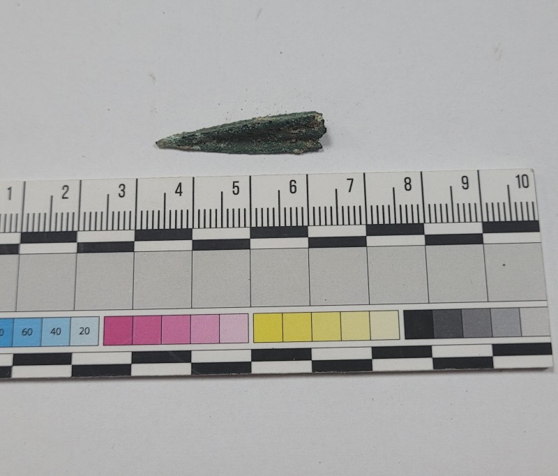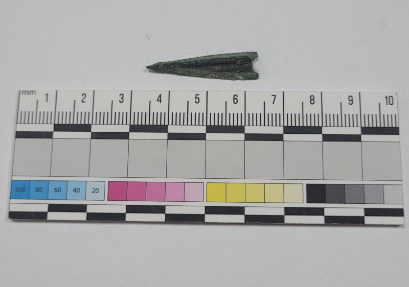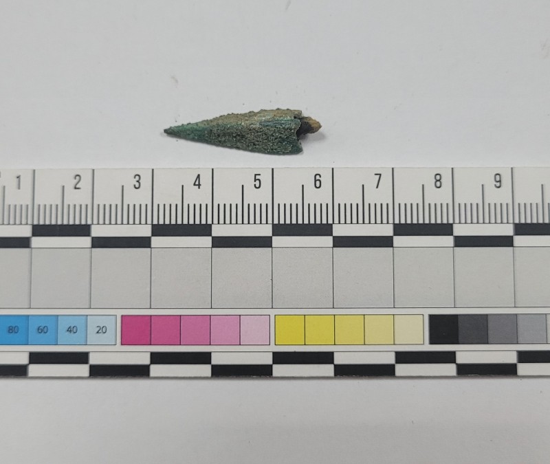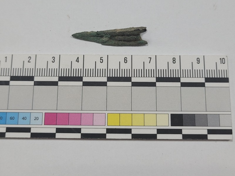 Вістря стріли, тригранне, з гострою пірамідальною голівкою, опущеними лопатями, що утворюють шипи, та схованою втулкою (деформоване та значно пошкоджене). Скіфський період (VIII-VII ст. до н.е.).
